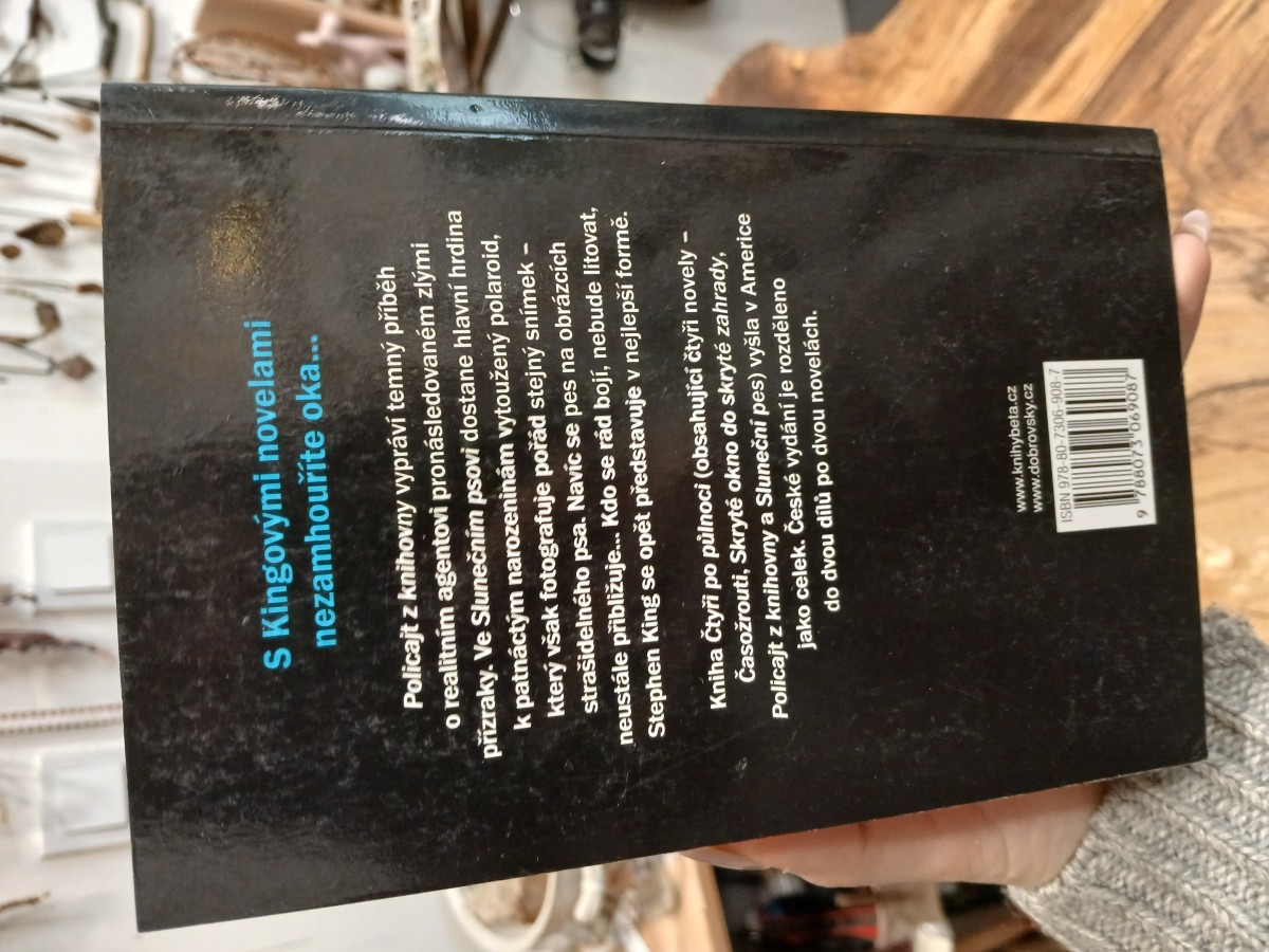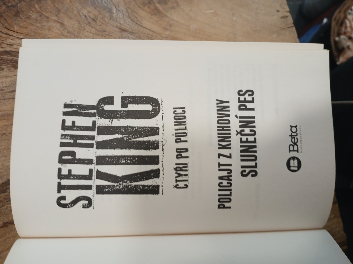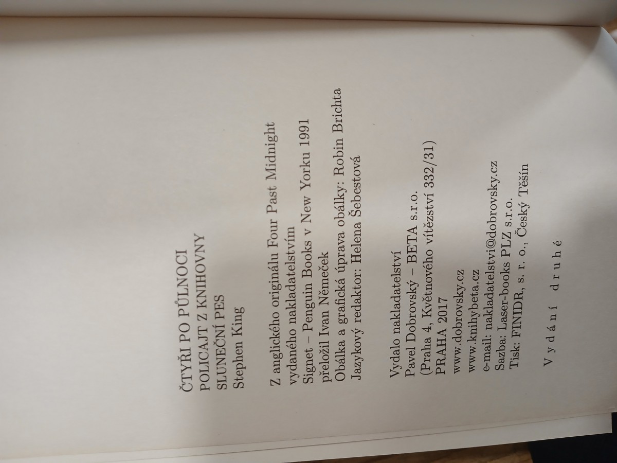 | Digitalizovaná tiráž: | ČTYŘI PO PŮLNOCI POLICAJT Z KNIHOVNY SLUNEČNÍ PES Stephen King Z anglického originálu Four Past Midnight vydaného nakladatelstvím Signet Penguin Books v New Yorku 1991 přeložil Ivan Němeček Obálka a grafická úprava obálky: Robin Brichta Jazykový redaktor: Helena Šebestová Vydalo nakladatelství Pavel Dobrovský - BETA s.r.o. (Praha 4, Květnového vítězství 332/31) PRAHA 2017 www.dobrovsky.cz www.knihybeta.cz e-mail: nakladatelstvi@dobrovsky.cz Sazba: Laser-books PLZ s.r.o. Tisk: FINIDR, s. r. o., Český Těšín Vydání druhé |