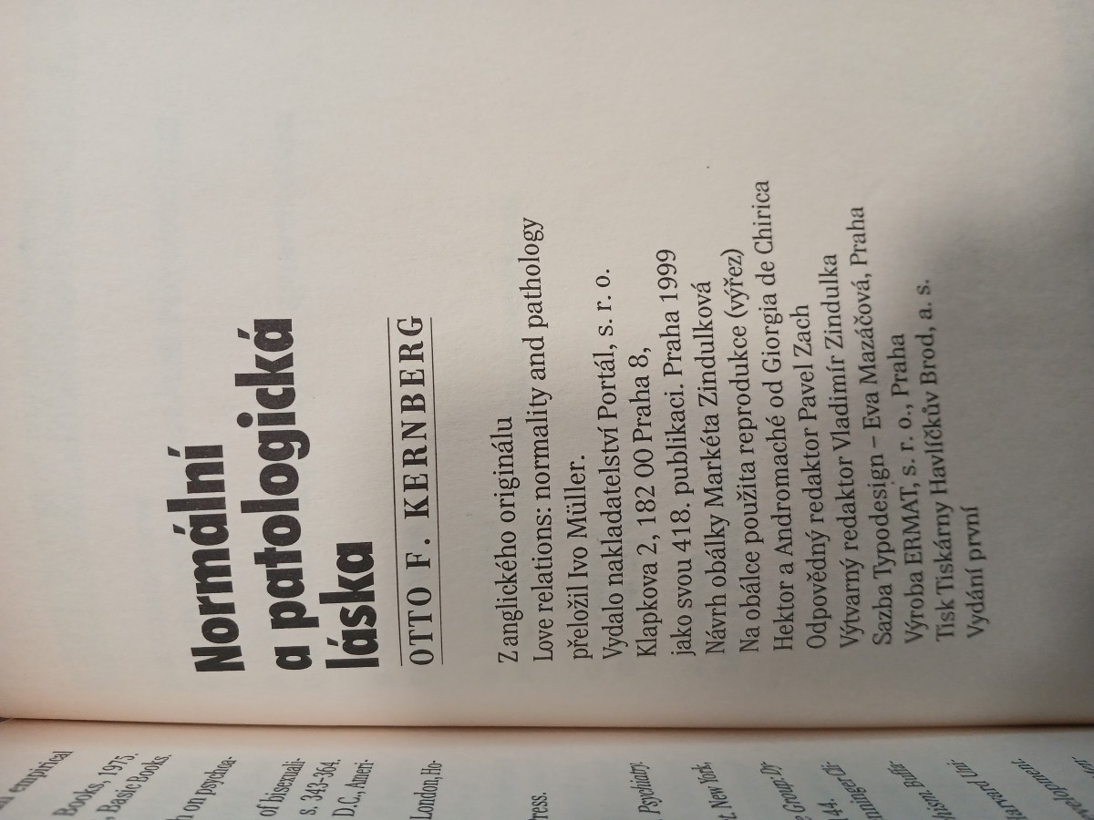 Digitalizovaná tiráž: empirical Books, 1975. Basic Books. on psychica of bisexuali S.343-364. D.C., Ameri London, Ho ress. Psychiatry Normální a patologická láska OTTO F. KERNBERG New York, Group: Dy 44. nninger Cli ism. Buffa Zanglického originálu Love relations: normality and pathology přeložil Ivo Müller. Vydalo nakladatelství Portál, s. r. o. Klapkova 2, 182 00 Praha 8, jako svou 418. publikaci. Praha 1999 Návrh obálky Markéta Zindulková Na obálce použita reprodukce (výřez) Hektor a Andromaché od Giorgia de Chirica Odpovědný redaktor Pavel Zach Výtvarný redaktor Vladimír Zindulka Sazba Typodesign - Eva Mazáčová, Praha Výroba ERMAT, s. r. o., Praha Tisk Tiskárny Havlíčkův Brod, a. s. Vydání první шәшборала PJBAT