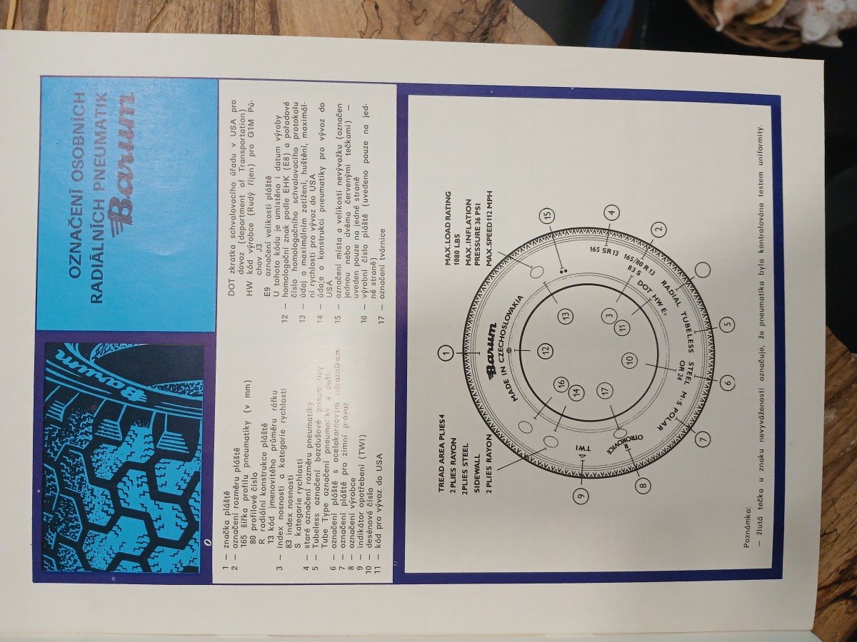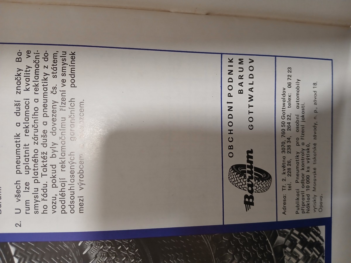 Digitalizovaná tiráž: 2. U všech pneumatik a duší značky Ba- rum lze uplatnit reklamaci kvality ve smyslu platného záručního a reklamační- ho řádu. Taktéž duše a pneumatiky z do- vozu, pokud byly dovezeny čs. státem, podléhají reklamačnímu řízení ve smyslu odsouhlasených garančních podmínek mezi výrobcem azcem. OBCHODNÍ PODNIK Barum BARUM GOTTWALDOV Adresa: Tř. 2. května 3070, 760 50 Gottwaldov tel. 228 26, 238 34, 264 22, telex: 06 72 23 Publikaci Pneumatiky pro osobní automobily připravil odbor kontroly a řízení jakosti. Náklad 10 000 ks výtisků, vytiskly Moravské tiskařské závody, n. p., závod 18, Opava.