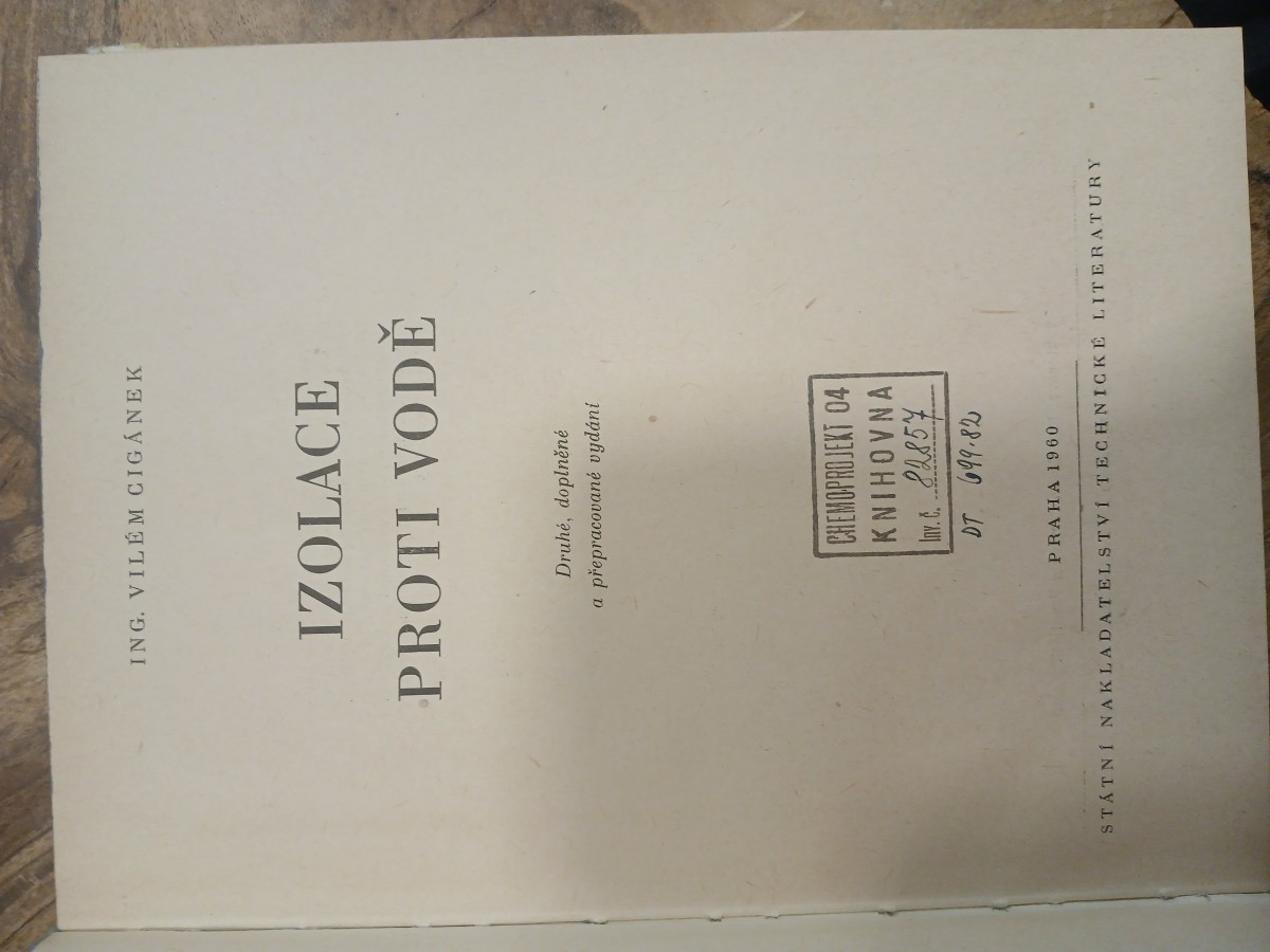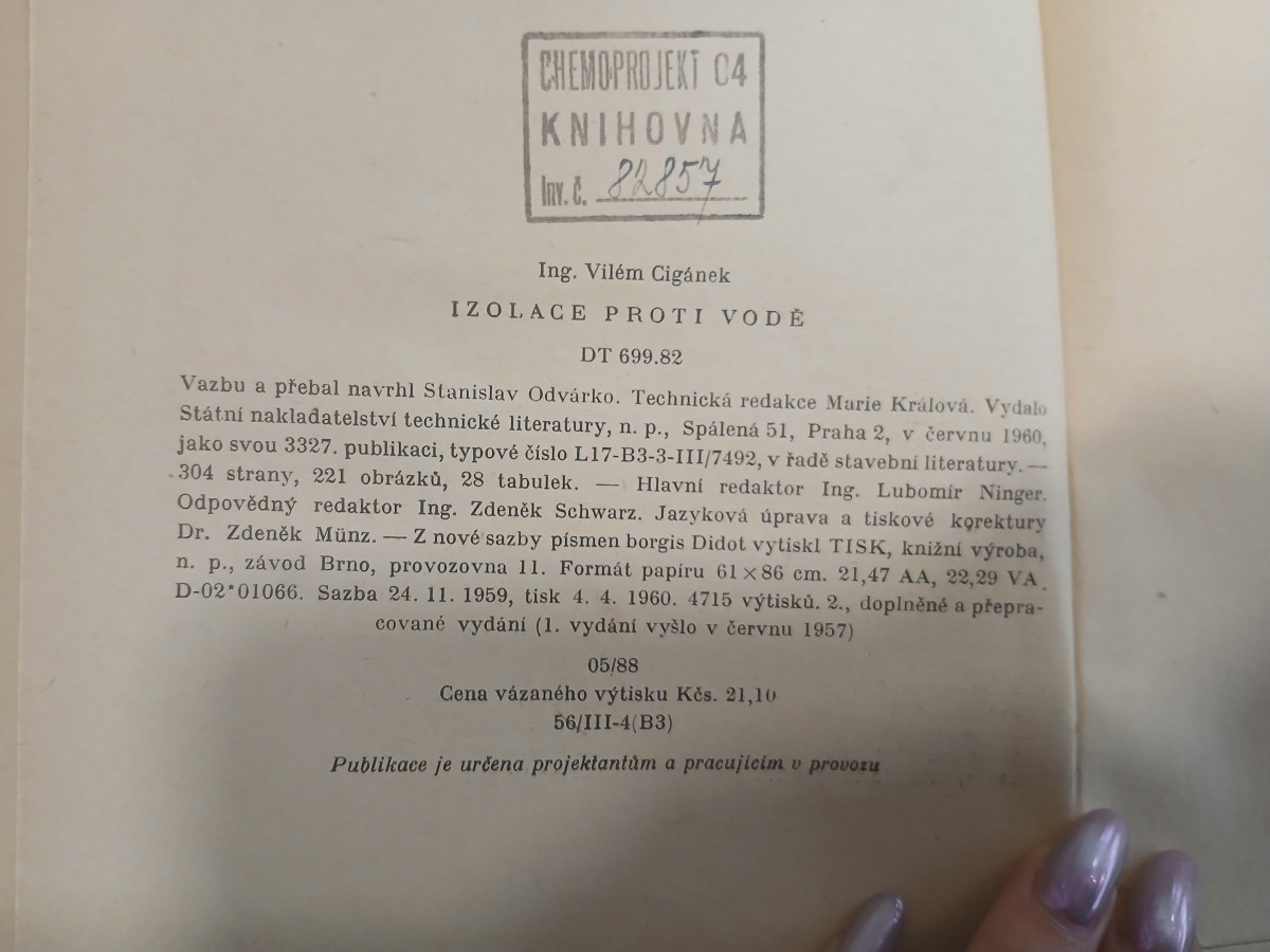 Digitalizovaná tiráž: CHEMOPROJEKT C4 KNIHOVNA Dr. c. 82857 Ing. Vilém Cigánek IZOLACE PROTI VODĚ DT 699.82 Vazbu a přebal navrhl Stanislav Odvárko. Technická redakce Marie Králová. Vydalo Státní nakladatelství technické literatury, n. p., Spálená 51, Praha 2, v červnu 1960, jako svou 3327. publikaci, typové číslo L17-B3-3-III/7492, v řadě stavební literatury.- 304 strany, 221 obrázků, 28 tabulek. - Hlavní redaktor Ing. Lubomír Ninger. Odpovědný redaktor Ing. Zdeněk Schwarz. Jazyková úprava a tiskové korektury Dr. Zdeněk Münz. Z nové sazby písmen borgis Didot vytiskl TISK, knižní výroba, n. p., závod Brno, provozovna 11. Formát papíru 61 x 86 cm. 21,47 AA, 22,29 VA D-02 01066. Sazba 24. 11. 1959, tisk 4. 4. 1960. 4715 výtisků. 2., doplněné a přepra- cované vydání (1. vydání vyšlo v červnu 1957) 05/88 Cena vázaného výtisku Kčs. 21,10 56/III-4(B3) Publikace je určena projektantům a pracujícím v provozu